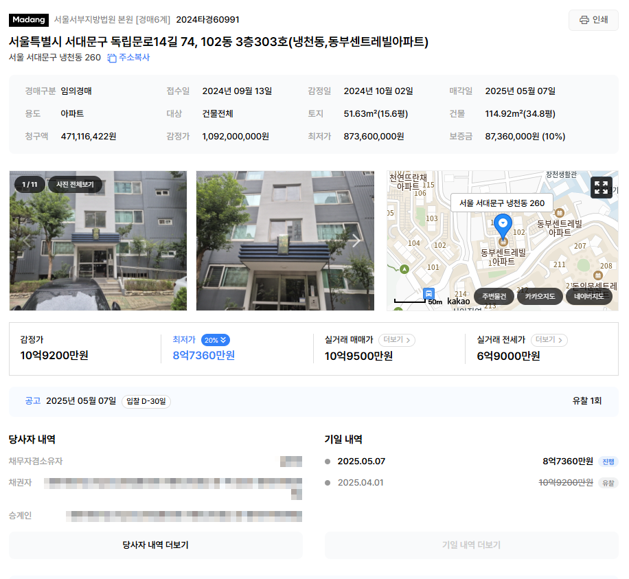 2024타경60991 '동부센트레빌아파트' 서울시 서대문구 냉천동에 위치한 2024타경60991 '동부센트레빌아파트'에 대한 경매 건입니다. 2025년 5월 7일 감정가 : 10억9200만원 최저가 : 8억7360만원 경매물건 2025.04.08
