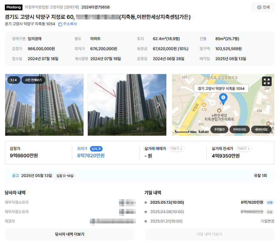 2024타경75658 '이편한세상지축센텀가든' 경기도 고양시 지축동에 위치한2024타경75658 '이편한세상지축센텀가든'에 대한 경매 건입니다. 2025년 5월 13일 감정가 : 9억6600만원최저가 : 6억7620만원 https://youtu.be/H8ygHgSE5Qk 경매물건 2025.04.27