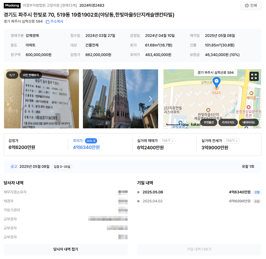 2024타경2483 '한빛마을5단지캐슬앤칸타빌' 경기도 파주시 야당동에 위치한2024타경2483 '한빛마을5단지캐슬앤칸타빌'에 대한 경매 건입니다.2025년 5월 8일 감정가 : 6억6200만원최저가 : 4억6340만원 경매물건 2025.04.04