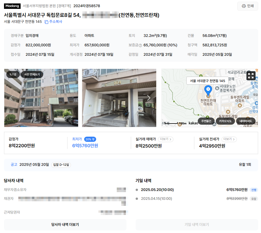 2024타경58578 '천연뜨란채 아파트' 서울시 서대문구 천연동에 위치한2024타경58578 '천연뜨란채 아파트'에 대한 경매 건입니다. 2025년 5월 20일 감정가 : 8억2200만원최저가 : 6억5760만원 경매물건 2025.05.08